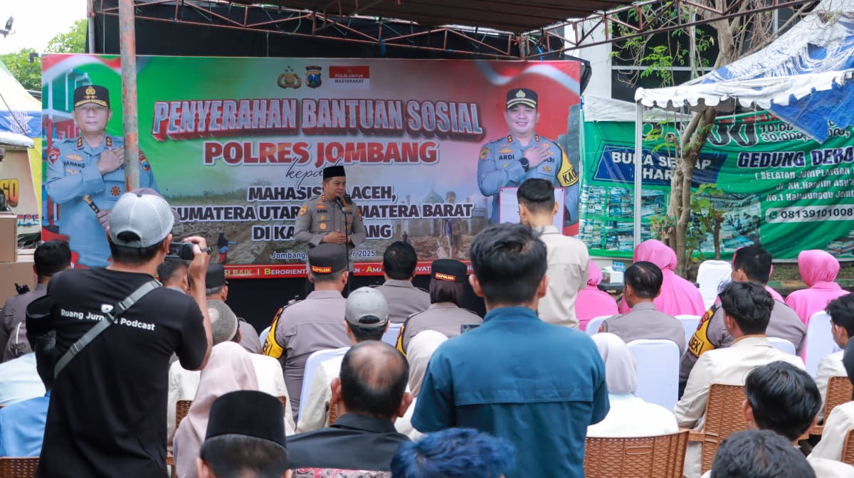 Jombang, Mitrajustice.id – Keluarga Besar Polres Jombang melaksanakan kegiatan pemberian bantuan sosial (bansos) kepada mahasiswa asal Aceh, Sumatera Utara, dan Sumatera Barat yang sedang menempuh pendidikan di Kabupaten Jombang. Kegiatan tersebut dilaksanakan pada Jumat, (19/12/2025), siang, bertempat di Posko Ojol, Jl. KH. Hasyim Asy’ari No. 1, Desa Kaliwungu, Kecamatan Jombang.