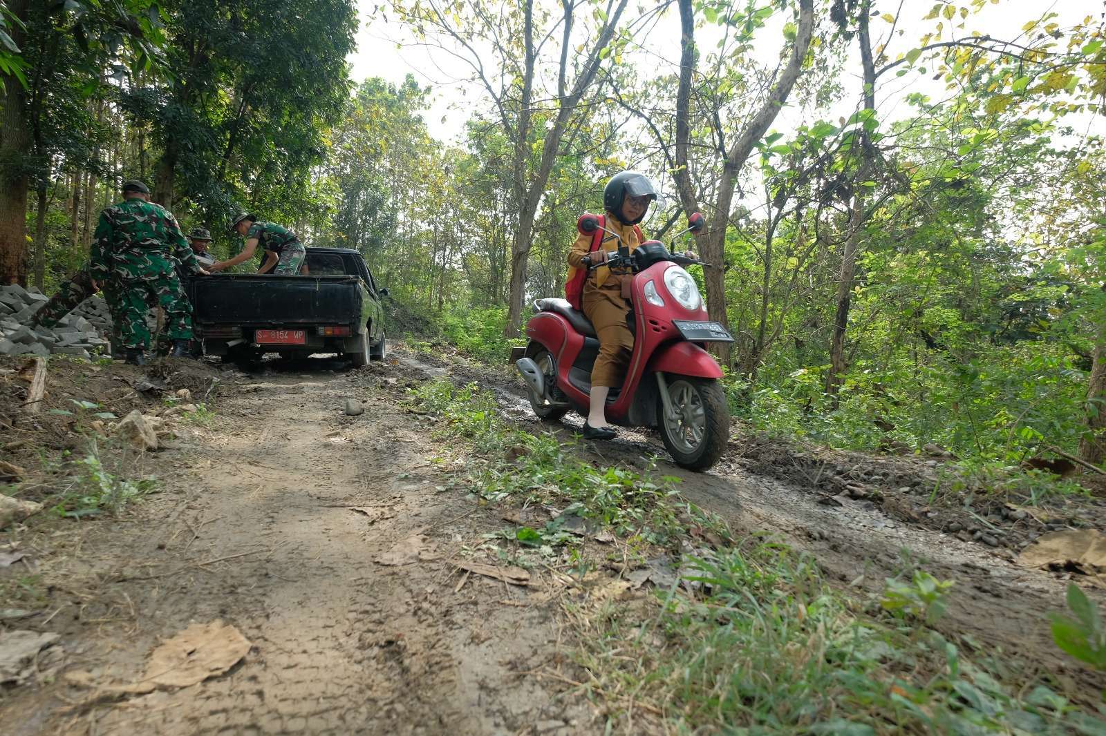 Jombang, Mitrajustice.id – Dalam sebuah potret yang penuh makna, terlihat seorang perempuan berseragam dinas melintasi jalan berlumpur dengan sepeda motornya. Di latar belakang, sejumlah anggota TNI dari Kodim 0814/Jombang tengah membongkar material bangunan dari bak kendaraan dinas. Lokasi ini adalah bagian dari sasaran pembangunan jalan pada kegiatan TMMD ke-125 di Desa Kromong, Kecamatan Ngusikan.